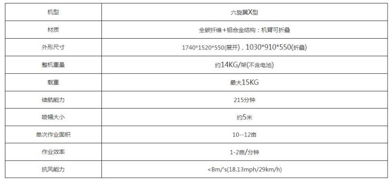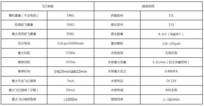 大载重是植保无人机发展的一个趋势,十五公斤现阶段已较为成熟。配置如下F: