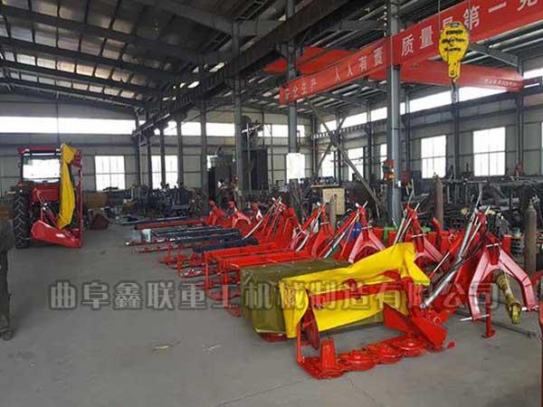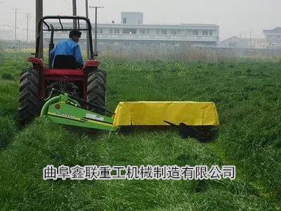 2、采用割草机连接到拖拉机后部悬挂牵引架,以动力输出轴带动作业。本机四个割刀盘的旋转,是由橡胶皮带(三角带)传动,使其机械结构简单,工作稳定性好,故障率低,维修成本低。